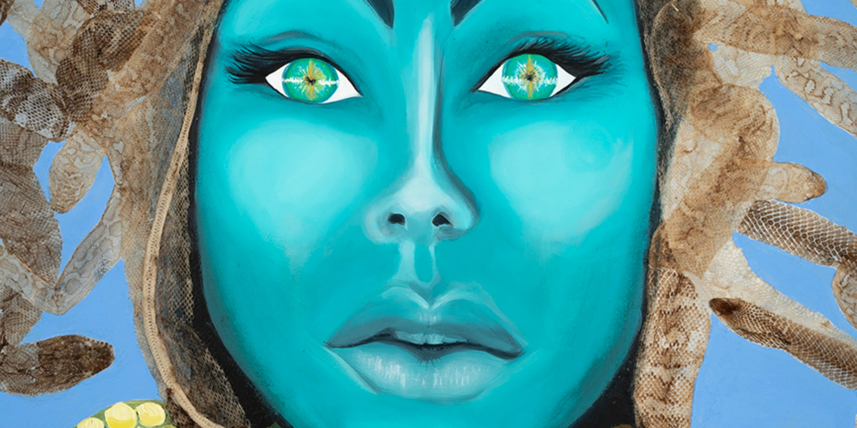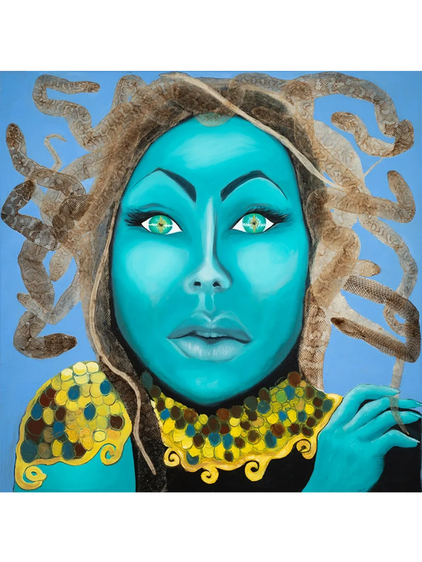 She glows with her teal skin, and real snake skins writhe in her hair. Adorned with gold and jewels, and an air of mystery.